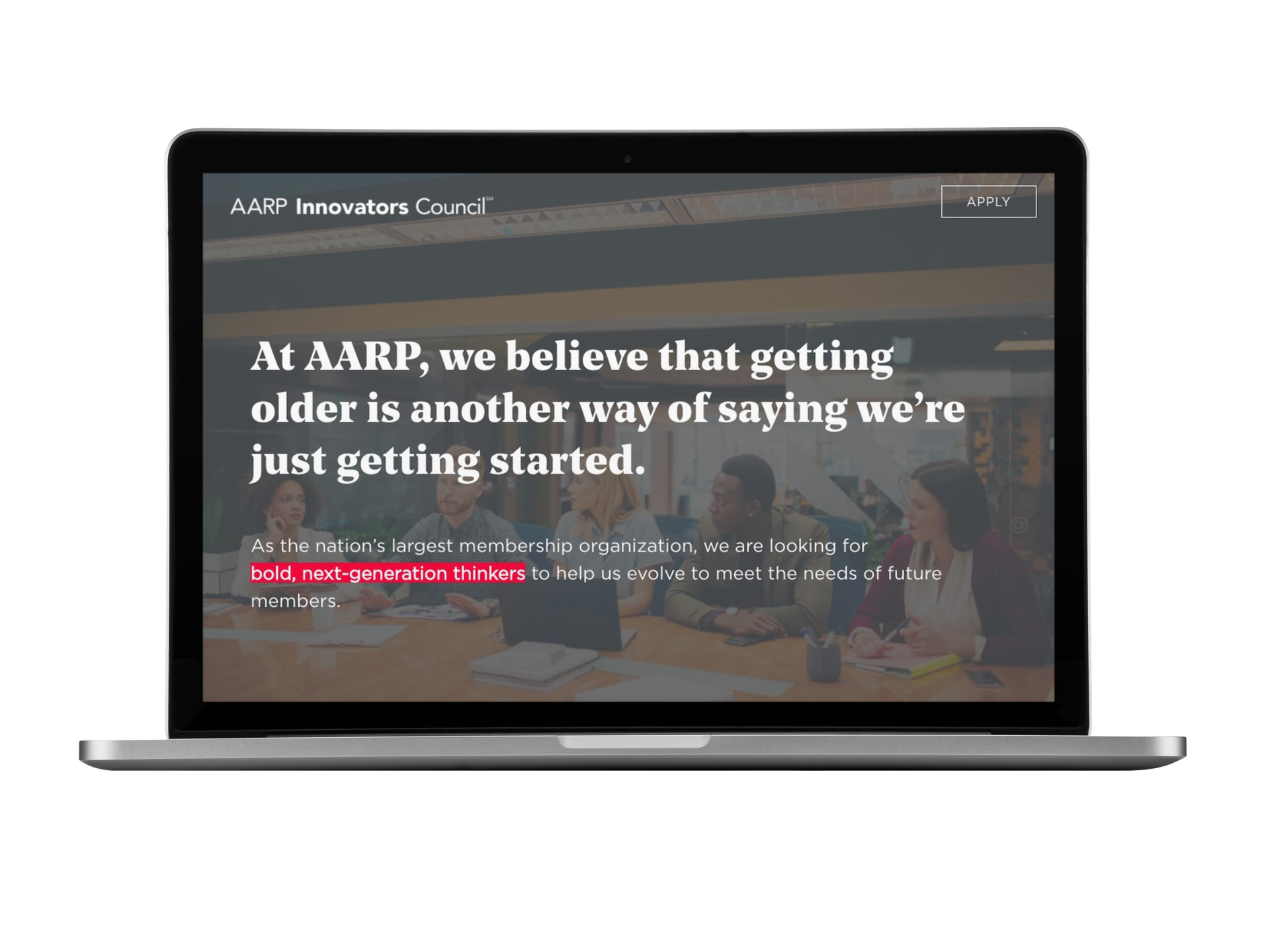 In collaboration with CEO Jo Ann Jenkins, we created the AARP Innovators Council (AIC), an external advisory group of millennial thought leaders in aligned industries such as healthy living, caregiving, and healthcare.